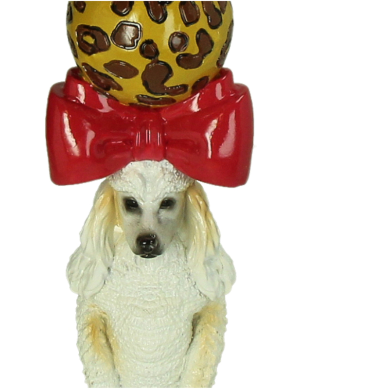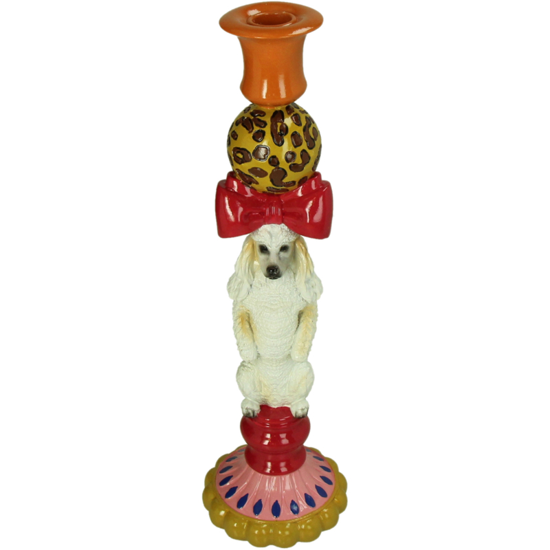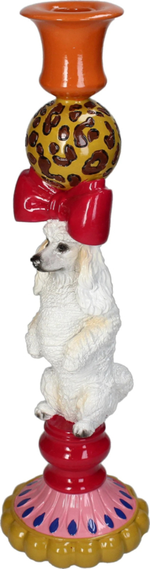 Deze kandelaar is echt een pronkstuk. De witte poedel staat trots op een veelkleurige standaard, heeft een prachtige rode strik op zijn hoofd en daarop een bal met tijgerprint en dan de oranje kaarshouder.